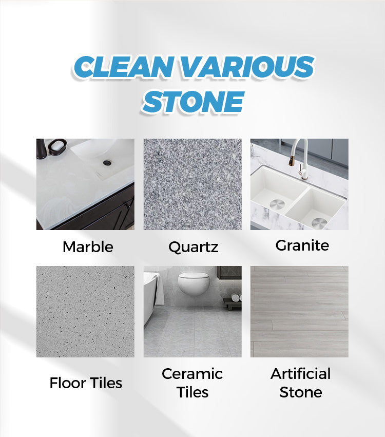Safe for countertops, floors, walls, bathroom areas, decorative stone pieces, and outdoor surfaces.